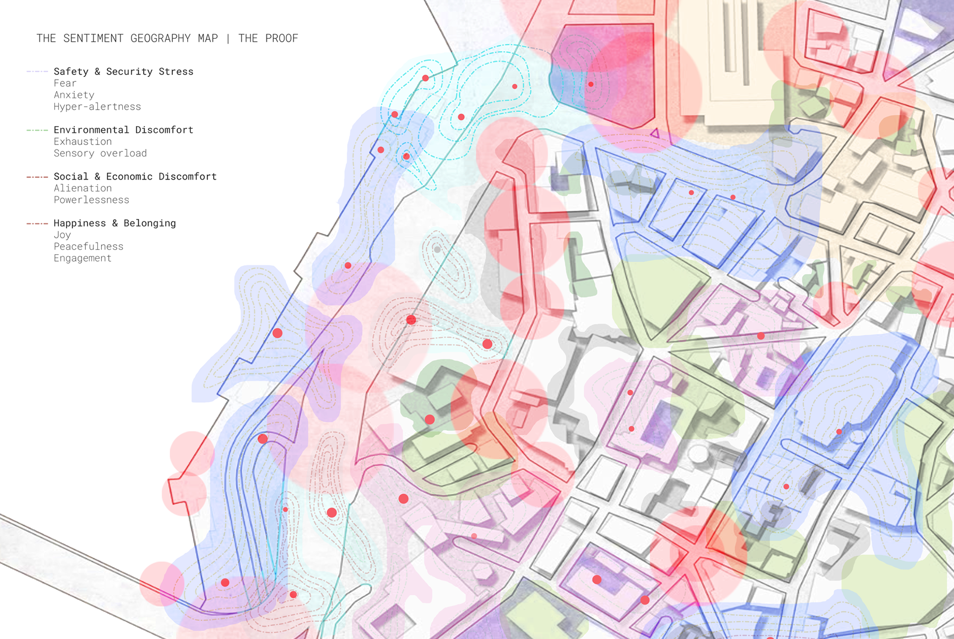 Based on the scraped and comments of social media it has been analyzed where all these comments are converted into specific map that is projected emotions shown as colors to the particular geo locations. Showcasing a multilayered map that helps in visualizations of design interventions and areas of concern. Bringing a subjective matrix into measurable metric.