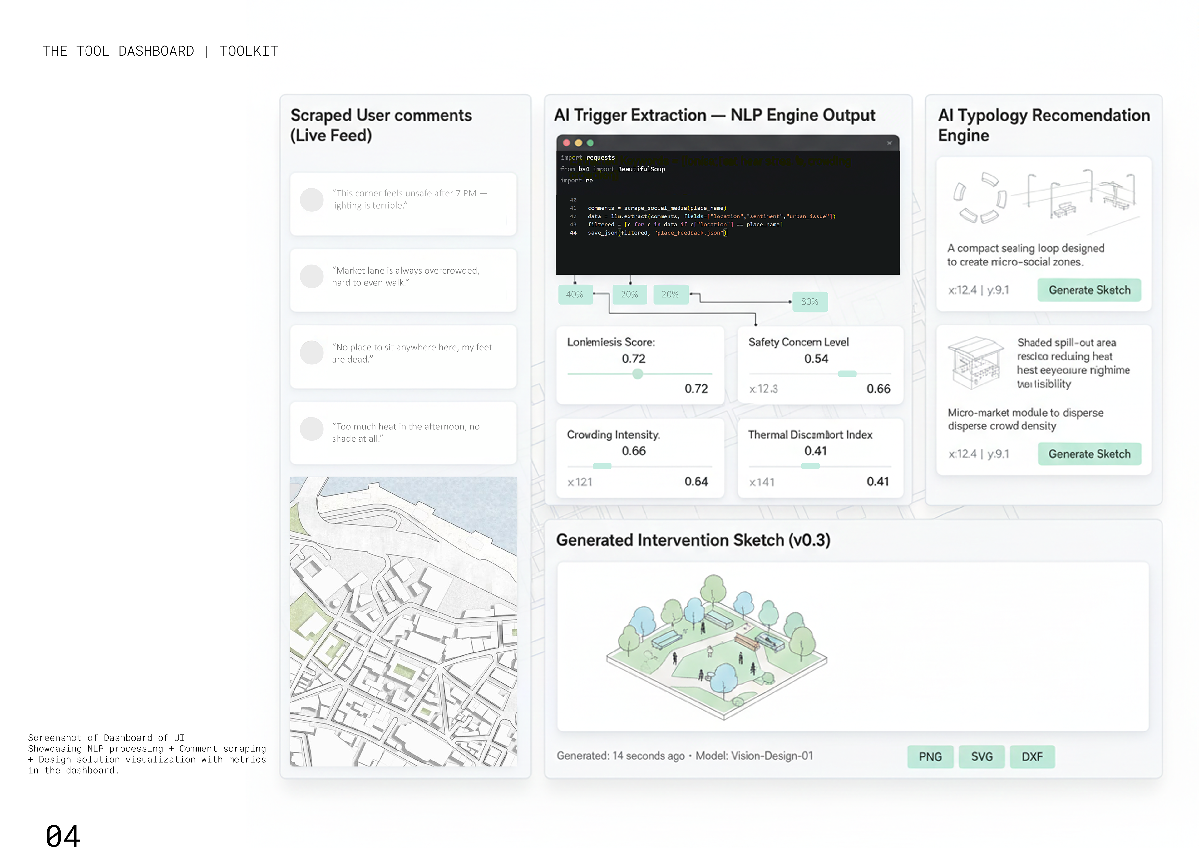 The UI interface is intended to be majorly used by designers. The dashboard to be conviction of major metrics which completely covers the pipeline. From scraped comments - NLP - Geotagged location specific Solutions - imaged through generative AI.