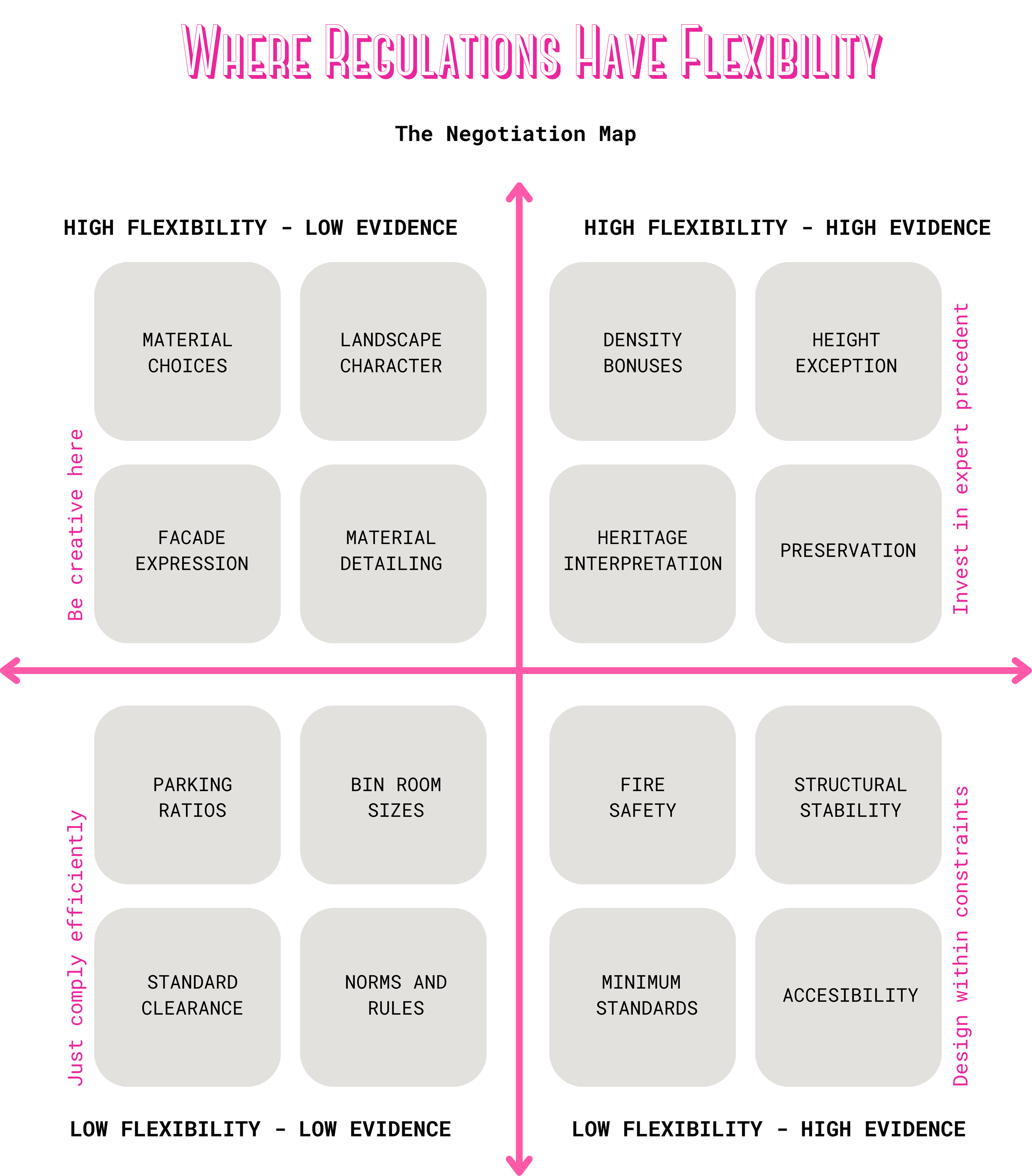 Knowing WHAT the rules say is basic. Knowing WHERE you can push—that's the skill. This map looks different in different countries, but the quadrants exist everywhere. I map them early in every project.