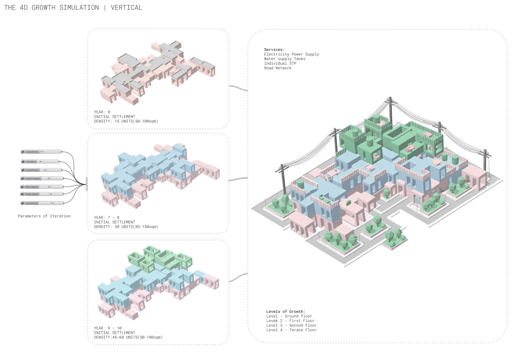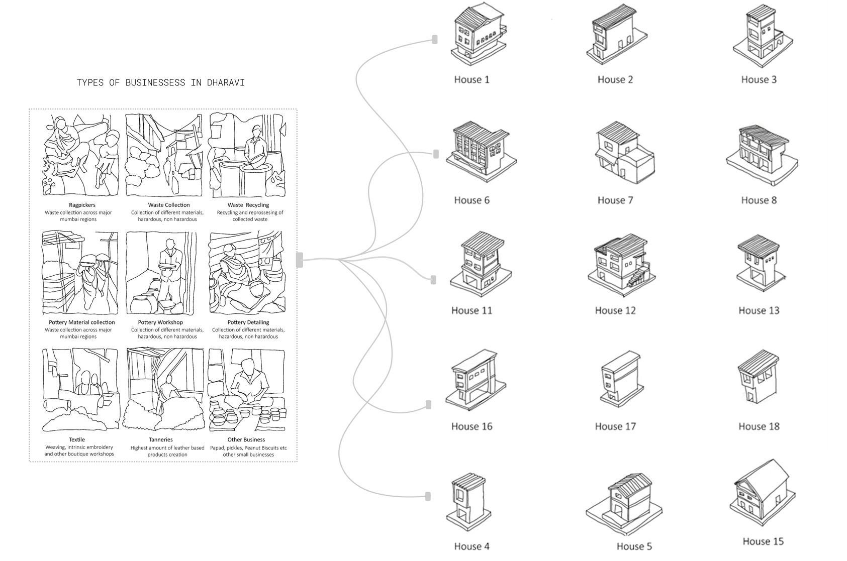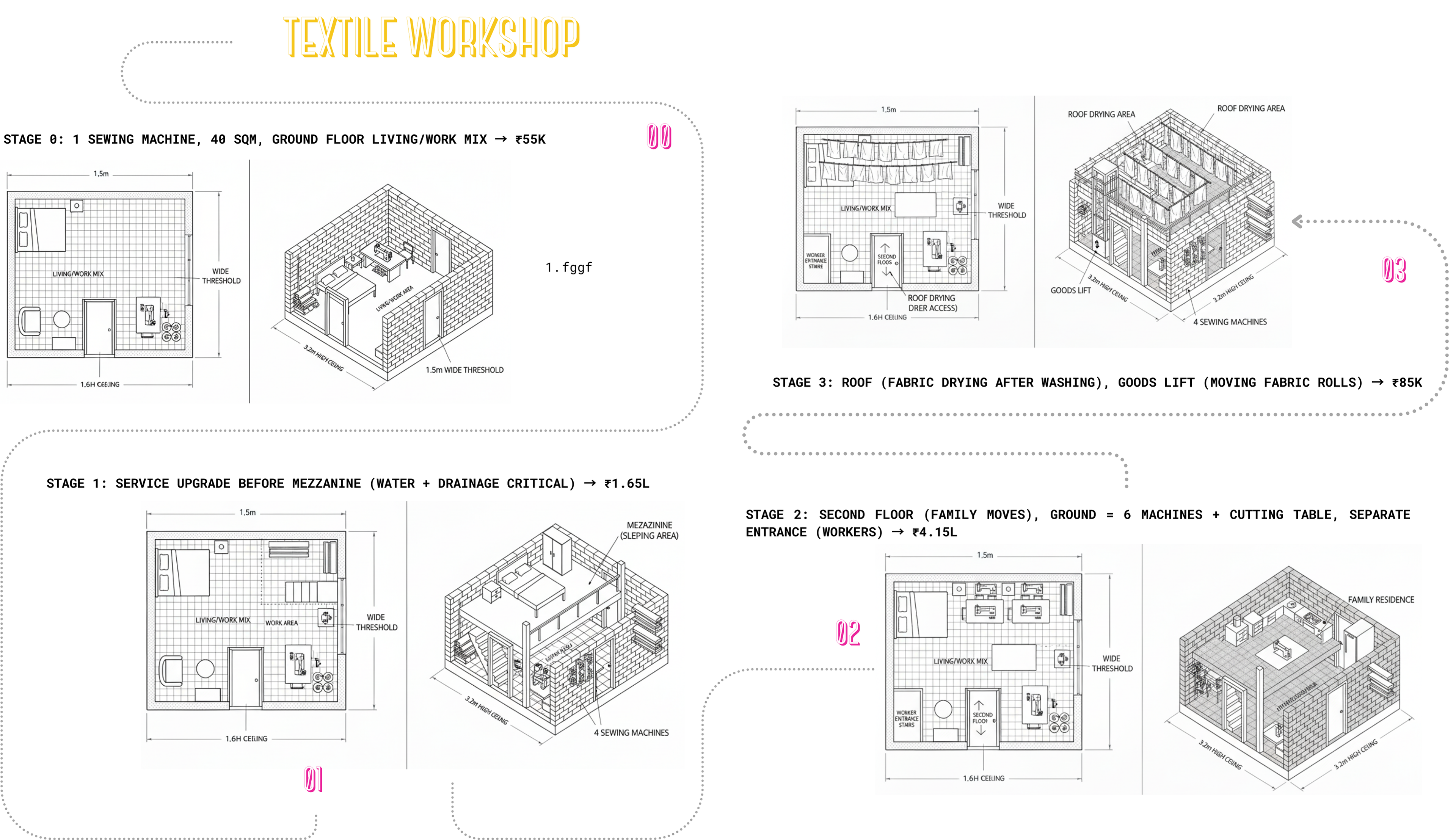 Its often assumed that growth is unpredictable in slums, but it can be understood that its not random. Everything follows a pattern. This pattern is decoded by scripting its design growth in details; for three specific business typologies: Textile-Pottery-Weaving.