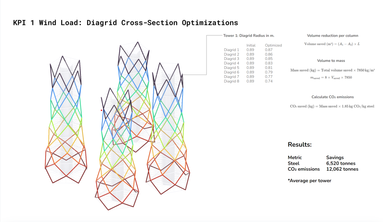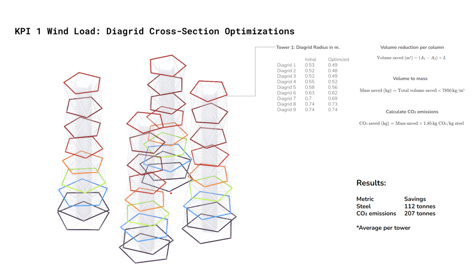 The middle row focuses on "KPI 1: Diagrid Cross-Section Optimizations," presented in two views. The first shows a stack of color-coded polygonal shapes representing the diagrid's cross-sections, while the second presents full 3D models of the diagrid structure. Both views include tables detailing "Tower 1: Diagrid Radius (in m)" with "Initial" and "Optimized" values for different elements, as well as calculations for volume, mass, and CO2 emissions. The results from the first view show Steel Savings of 112 tonnes and CO2 emissions Savings of 207 tonnes, while the second view shows more substantial Steel Savings of 6,520 tonnes and CO2 emissions Savings of 12,062 tonnes.