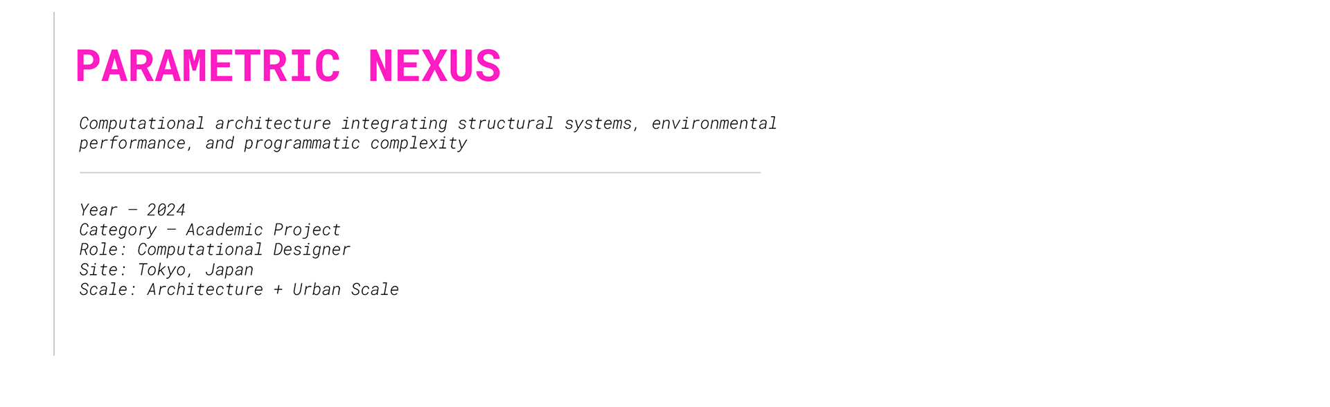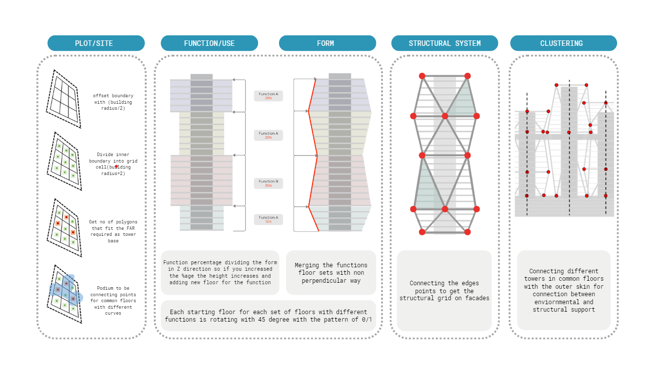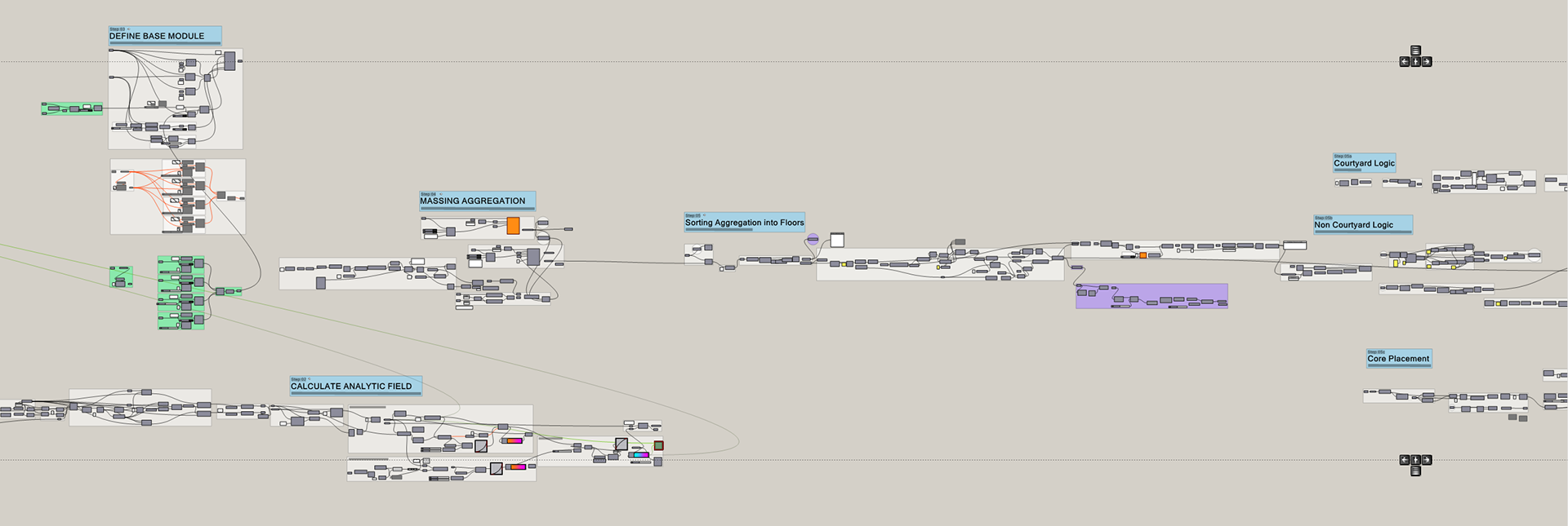 The design process begins by translating site boundaries and contextual constraints into parametric inputs. These inputs drive the generation of building envelopes, ensuring that geometry remains responsive to changing plot dimensions, regulations, and programmatic needs. This approach allows the model to remain adaptable across multiple scenarios while maintaining a consistent architectural logic.