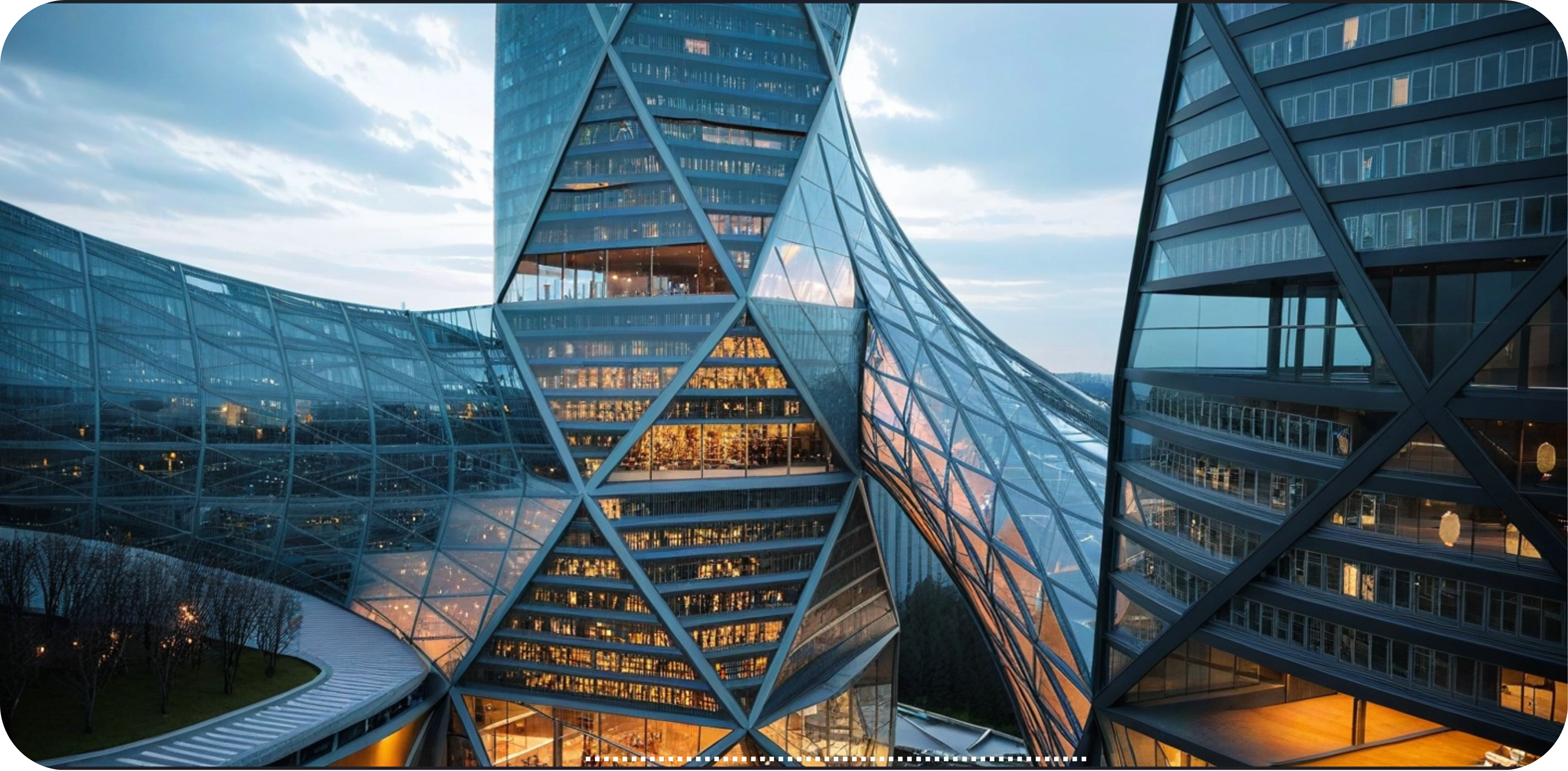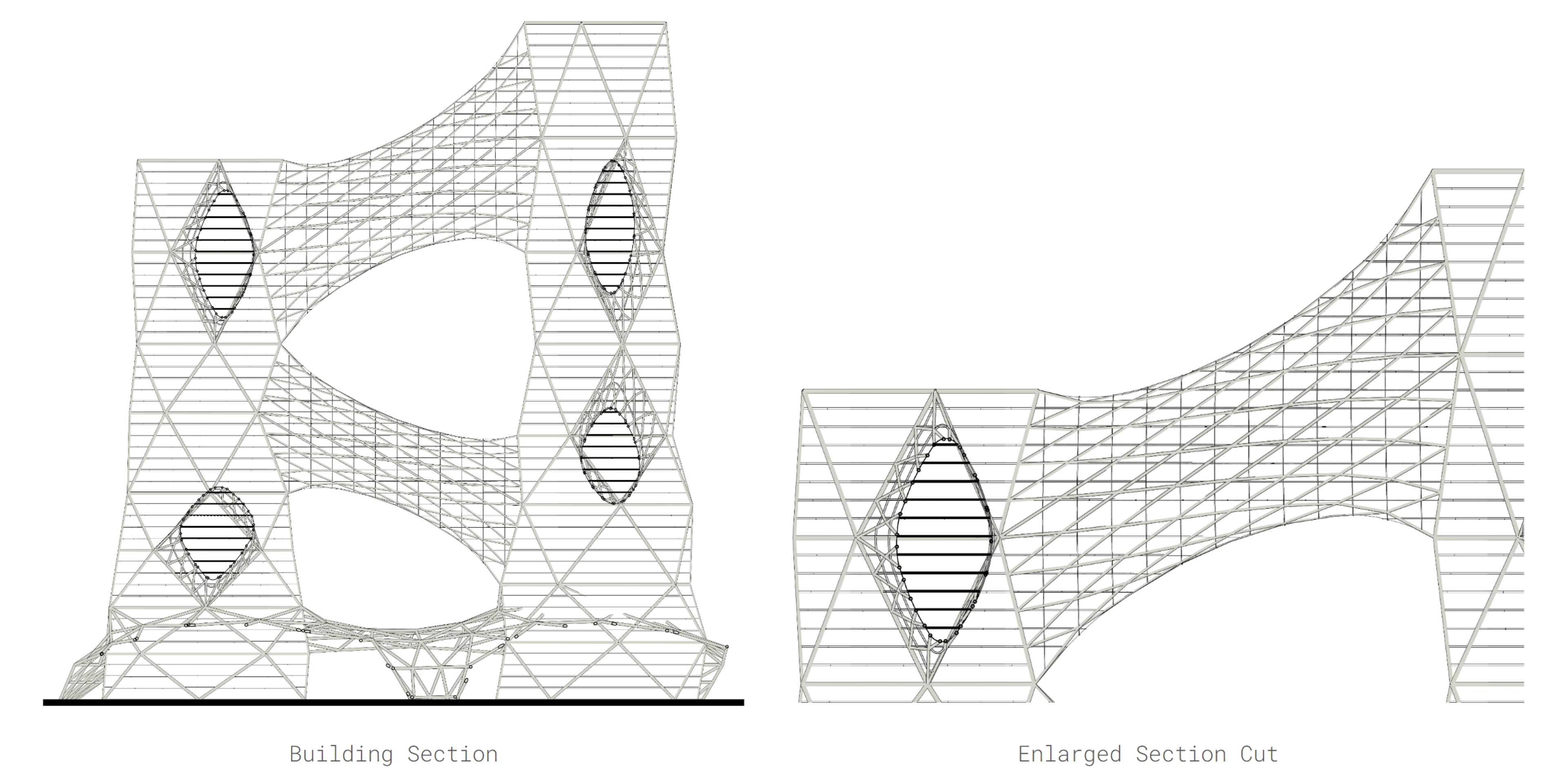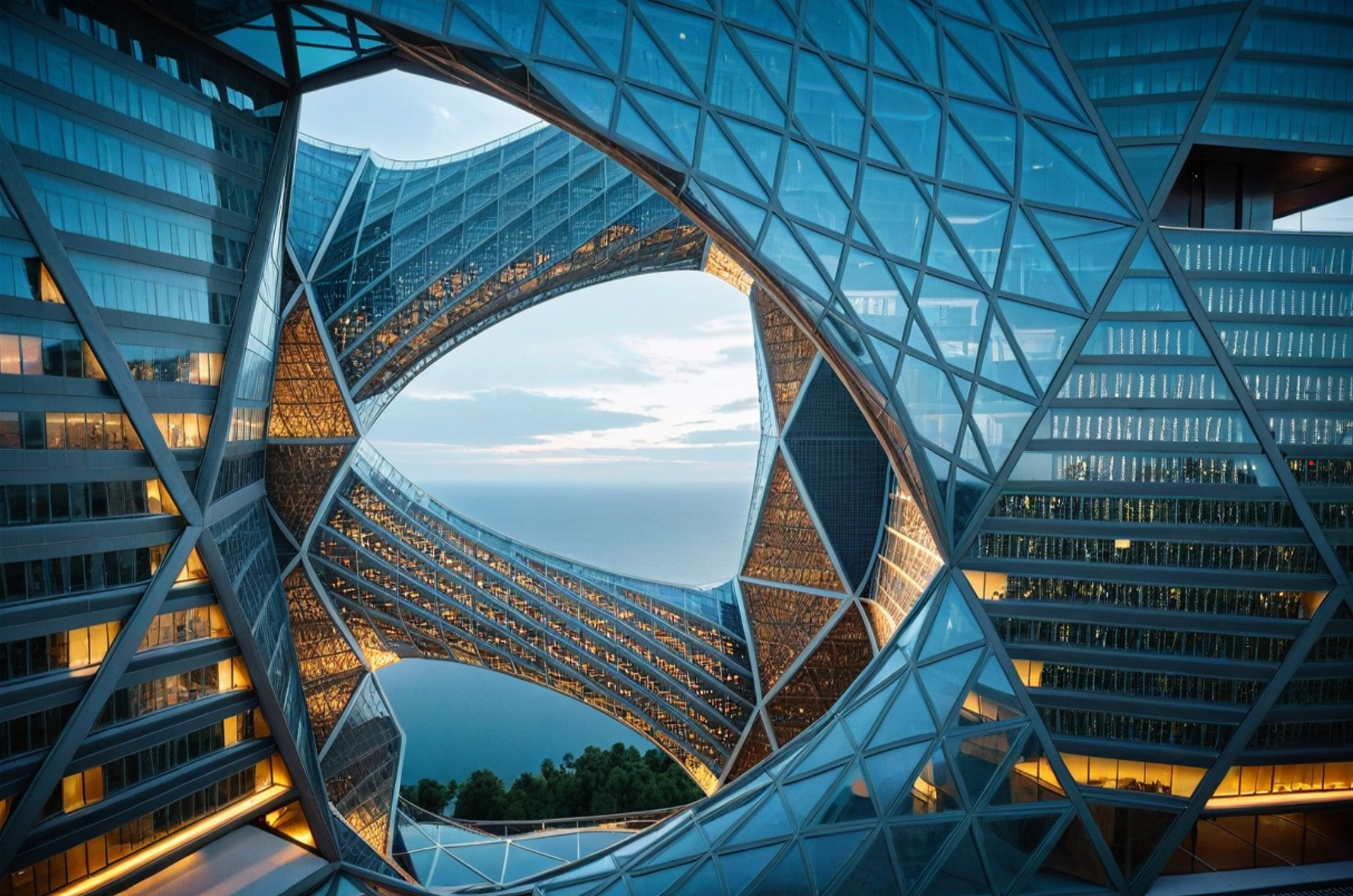 The diagrid exoskeleton operates as both a structural and architectural system. It optimizes material efficiency, reduces internal columns, and enables large open floor plates. Parametric control over grid density, joint placement, and panelization allows the structure to adapt locally to stresses, programmatic needs, and façade articulation.
