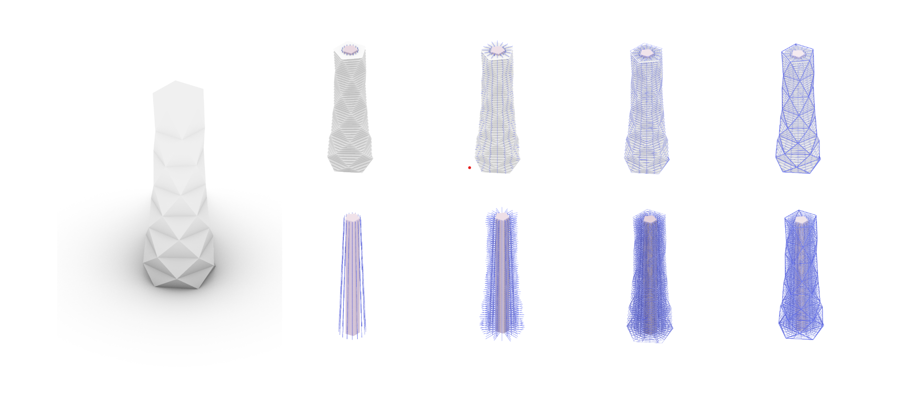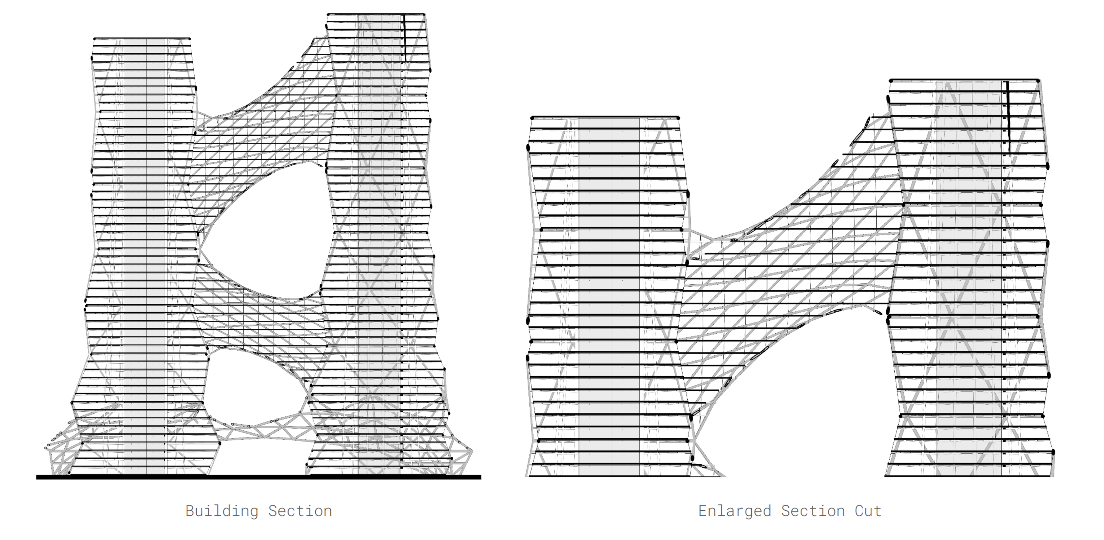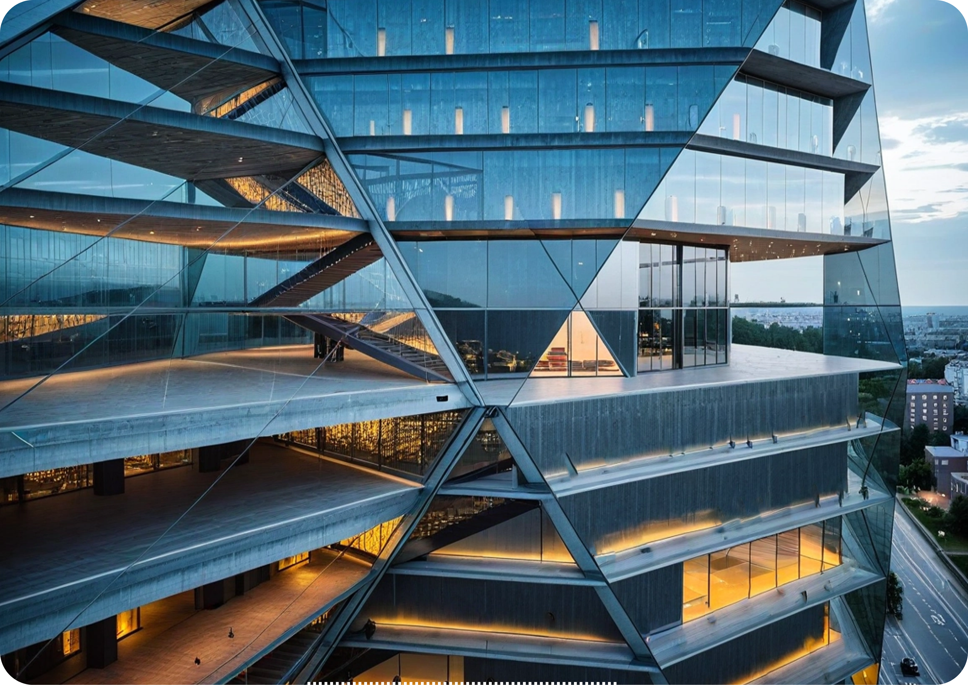 The diagrid exoskeleton operates as both a structural and architectural system. It optimizes material efficiency, reduces internal columns, and enables large open floor plates. Parametric control over grid density, joint placement, and panelization allows the structure to adapt locally to stresses, programmatic needs, and façade articulation.