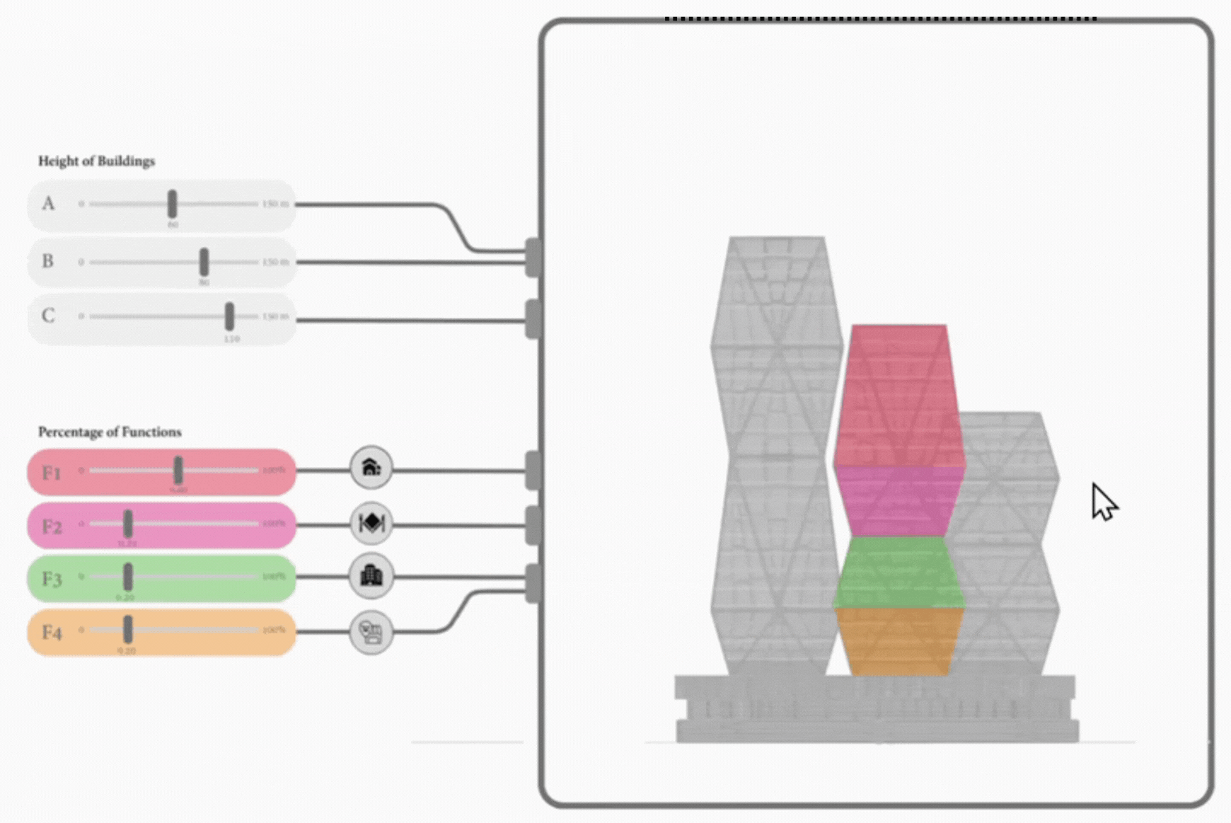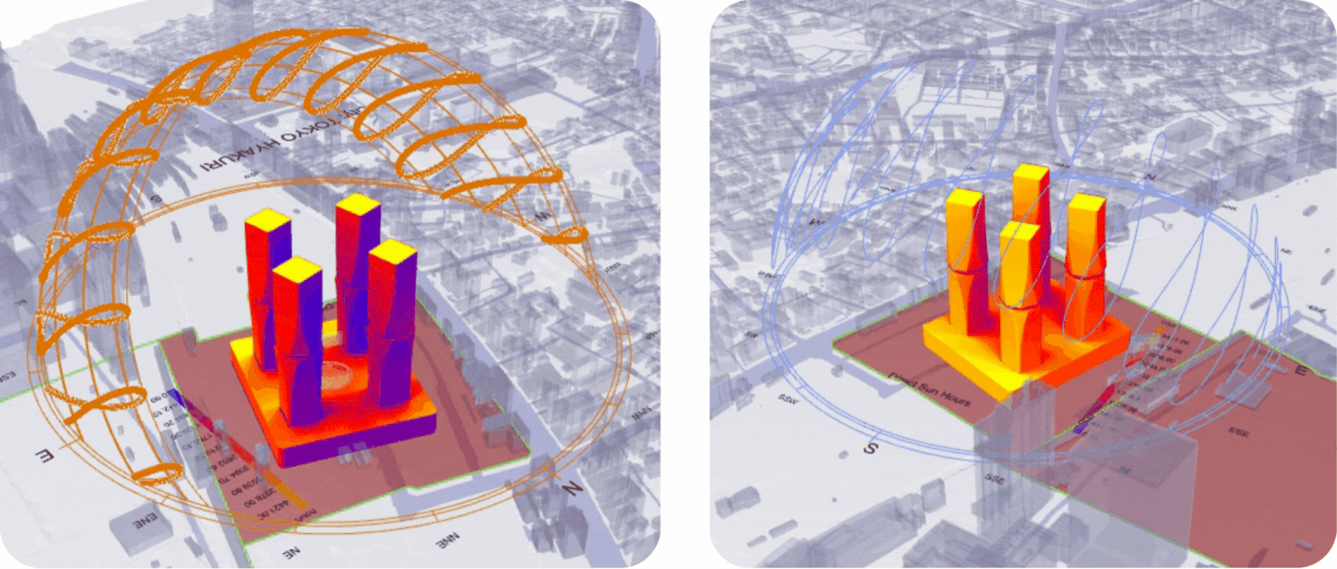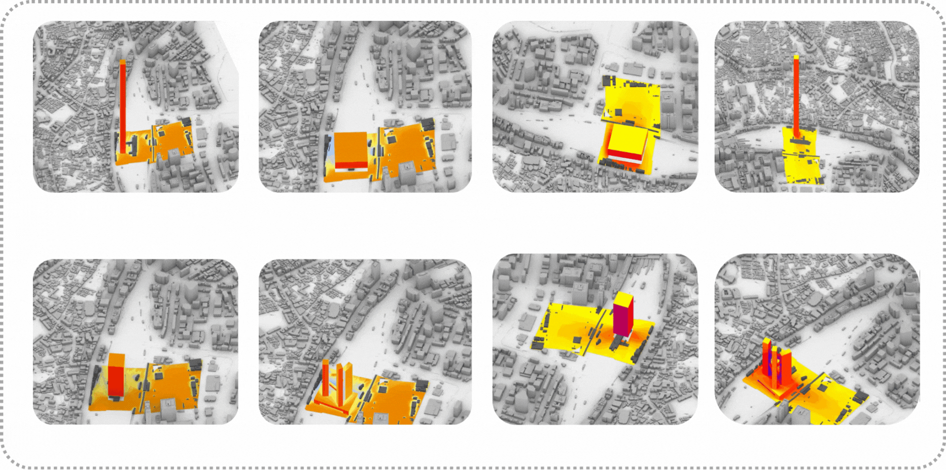 Environmental simulations were embedded directly into the design loop to evaluate daylight penetration and visual connectivity. By iterating façade openness, skin articulation, and building placement, the system balances solar access with spatial quality. Optimization tools such as Galapagos were used to identify configurations that achieve maximum daylight and views while respecting other constraints.