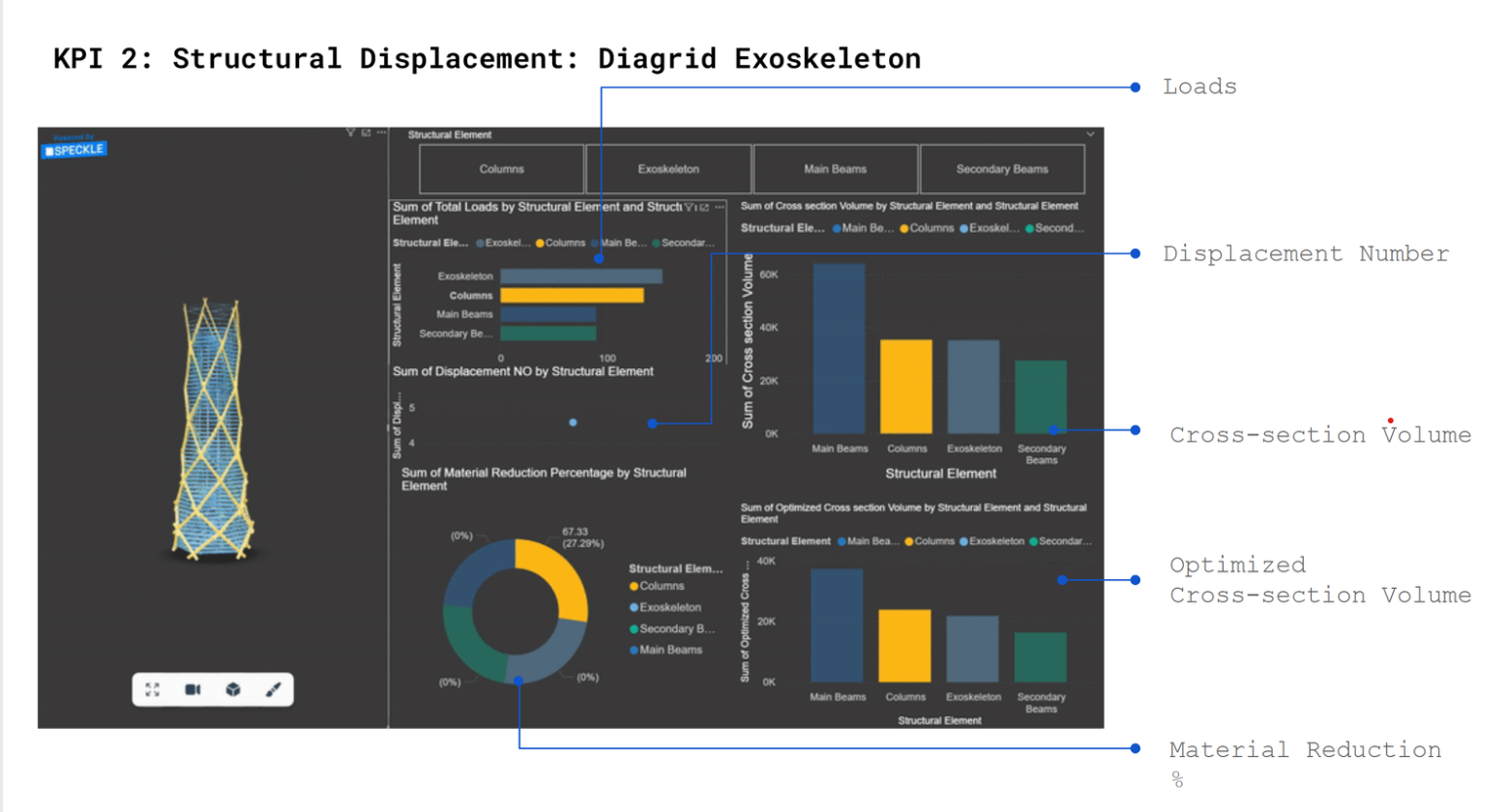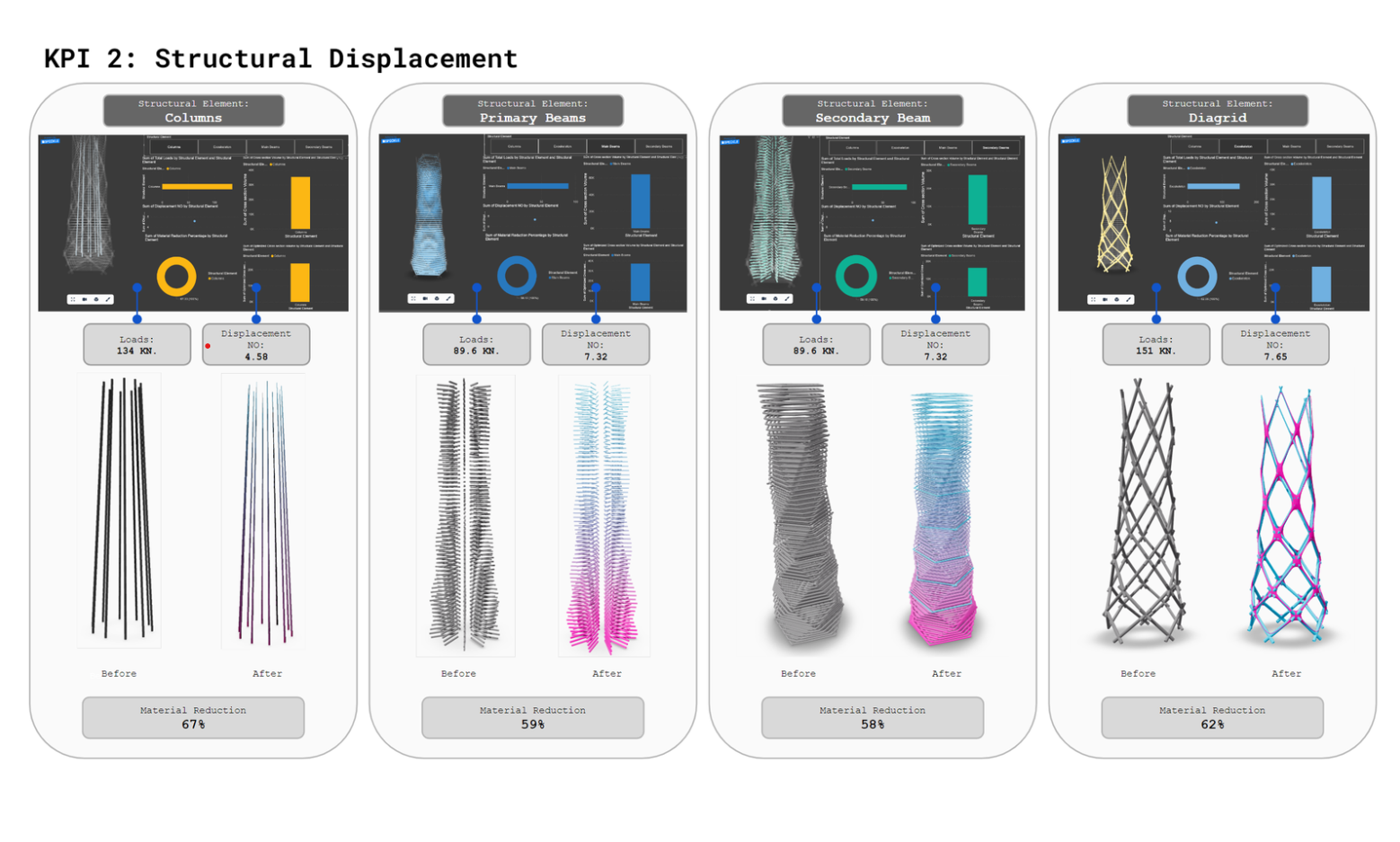The final row addresses "KPI 2: Structural Displacement." The first section is a dashboard screenshot labeled "KPI 2: Structural Displacement: Diagrid Exoskeleton," featuring a 3D model of the tower and several charts analyzing metrics like "Loads," "Displacement Number," "Cross-section Volume," and "Optimized Cross-section Volume." The second section, also titled "KPI 2: Structural Displacement," compares the displacement of four different systems: "Columns," "Primary Beams," "Secondary Beams," and "Diagrid." For each, visual representations show the structure "before" and "after" optimization, illustrating the reduction in displacement, with bar charts quantifying the displacement and 3D models providing visual context.