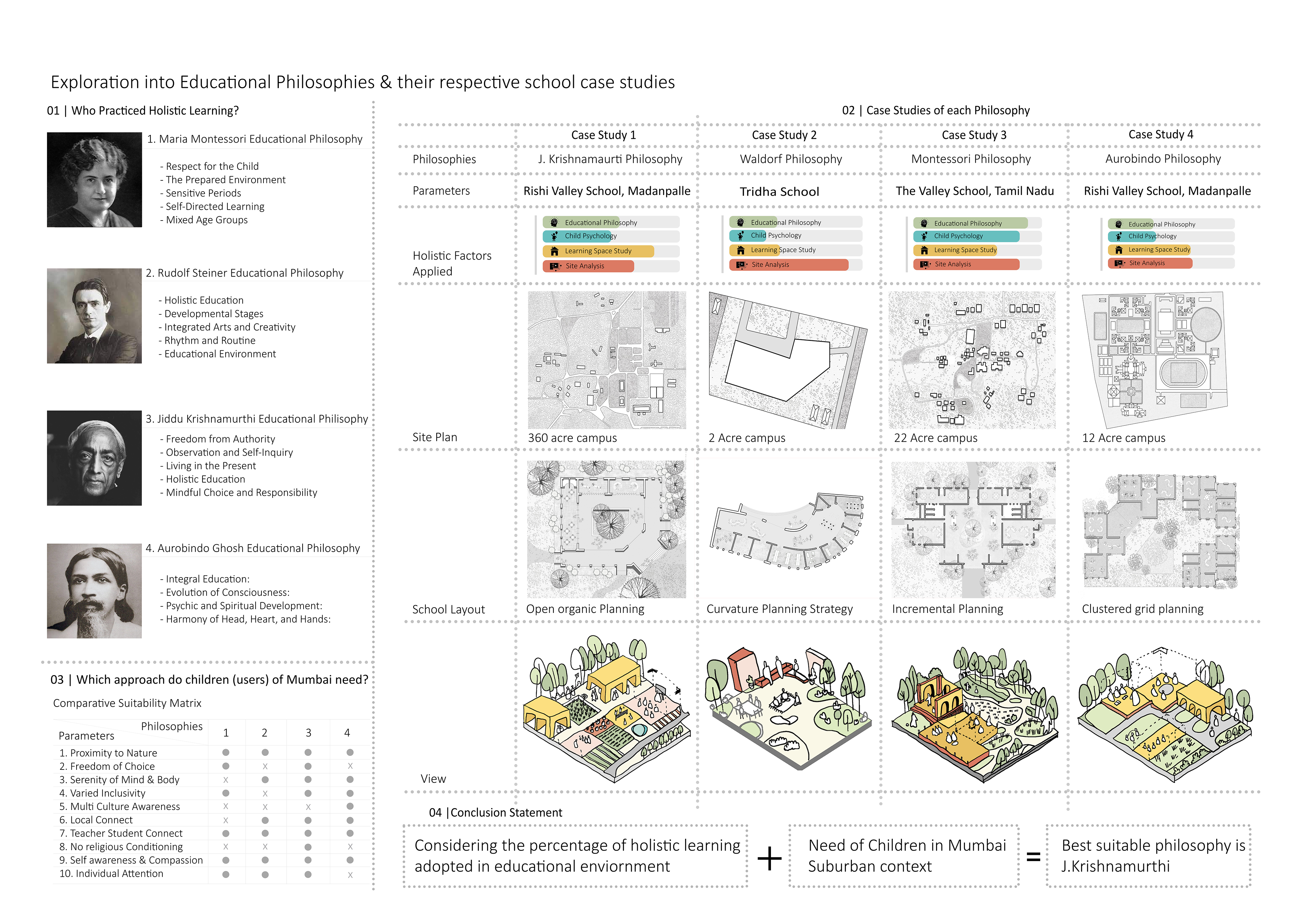 A critical analysis of four prominent educational philosophies—Maria Montessori, Rudolf Steiner, Jiddu Krishnamurti, and Aurobindo Ghosh—all of which advocate for some form of holistic learning, moving beyond the traditional, result-oriented model. The study explores the specific tenets of each philosophy, such as Montessori's focus on the Prepared Environment and Sensitive Periods, Steiner's emphasis on developmental stages and art integration, Krishnamurti's core idea of Freedom from Authority and Self-Inquiry, and Aurobindo's concept of Integral Education and Spiritual Development. To ground these theories in reality, four corresponding case studies of schools—ranging from the vast 360-acre Rishi Valley School (J. Krishnamurti) to the compact 2-acre Tridha School (Waldorf)—are analyzed based on their Site Plan and School Layout, such as the open organic planning versus the clustered grid planning.