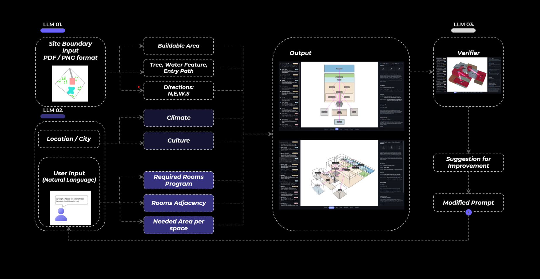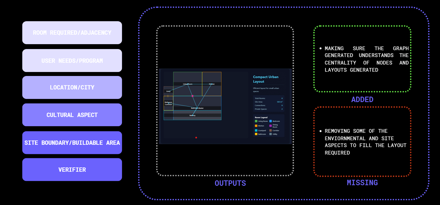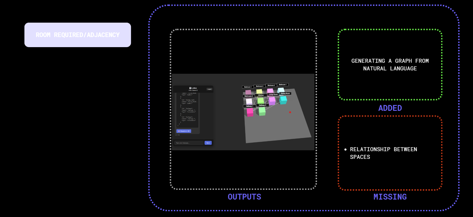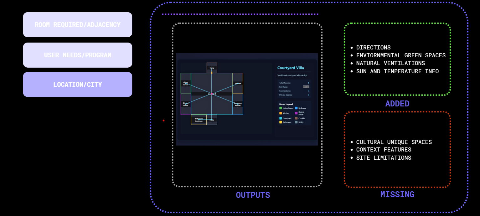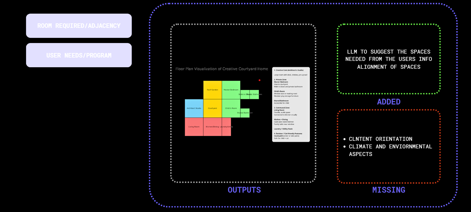 Early-stage house design is hard to formalize, and current tools don’t understand unstructured inputs. LLMs could bridge natural language and spatial logic, but no workflow exists to convert prompts into graph-based layouts. This missing link prevents LLMs from supporting conceptual design.